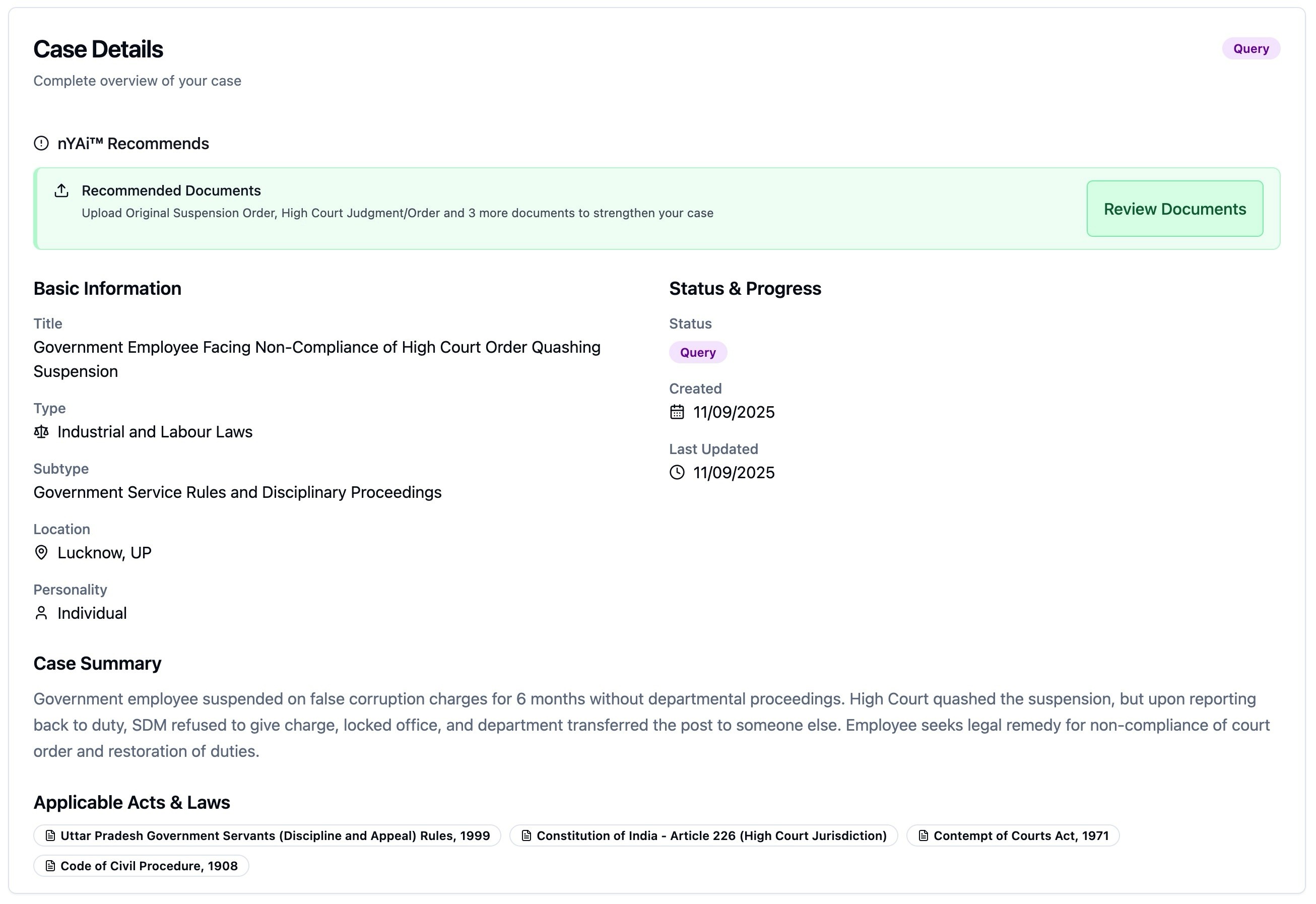 Whether you are preparing before speaking to an advocate, managing a litigation-heavy docket, or operating a business in India, NyaI™ is designed to give you clearer, faster access to what matters - without sacrificing traceability.