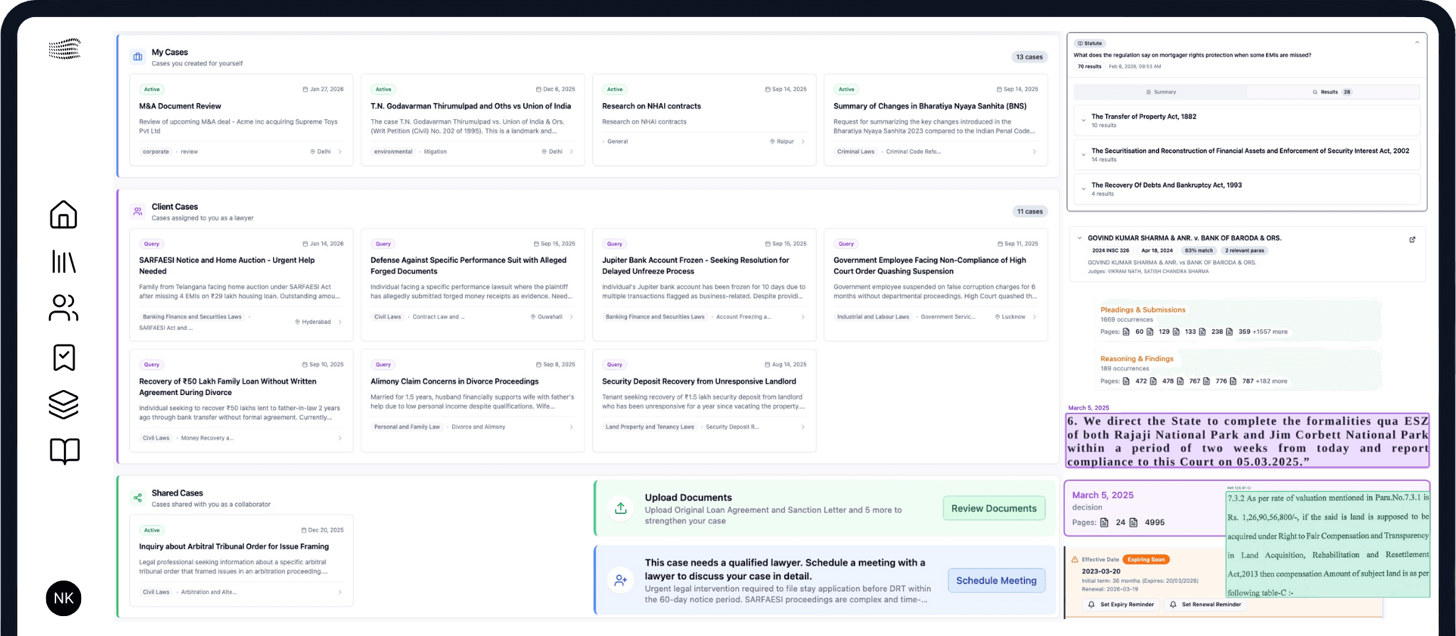 Litigation demands judgment, not administrative effort. Bharat.law reduces time spent on intake, document review, and fragmented research, allowing lawyers to focus on strategy, drafting, and advocacy.